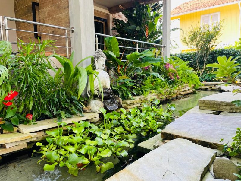 Ao se aventurar pelo exterior, você encontrará uma churrasqueira para momentos de confraternização, uma piscina deslumbrante com bar e pedra vulcânica, e até mesmo um lago com peixes, que adicionam um charme especial ao ambiente.