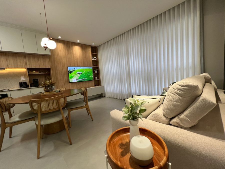 Com 42,79 m² muito bem distribuídos, o imóvel oferece um conceito moderno de integração entre sala e cozinha, proporcionando mais amplitude e funcionalidade no dia a dia. Totalmente mobiliado, decorado e equipado, este apartamento está simplesmente impecável — é entrar e morar!