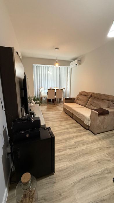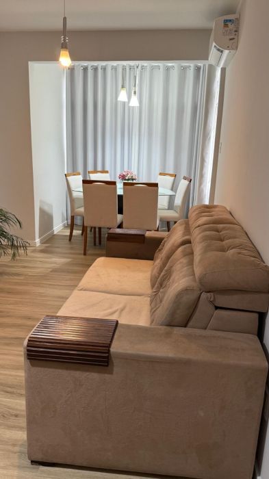 A sala de estar é ampla e confortável, com ar-condicionado recém instalado, e foi integrada à sacada, ampliando o espaço e criando um ambiente perfeito para receber amigos ou relaxar.