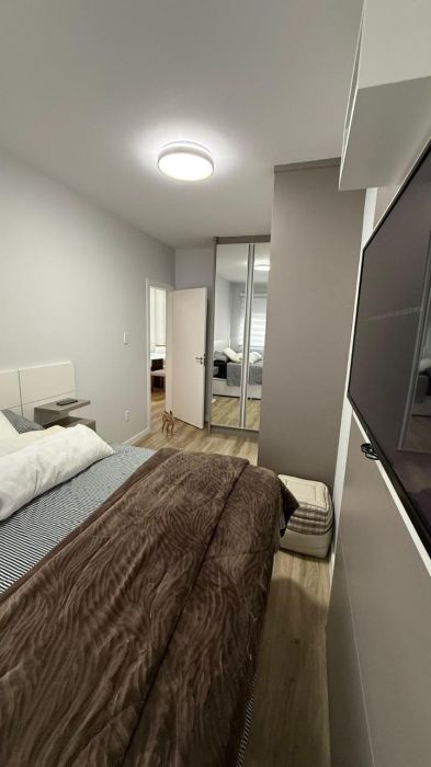 A planta conta com 2 dormitórios, ambos com móveis planejados, sendo o quarto de casal com marcenaria nova. O segundo quarto dispõe de roupeiro, ideal para organização no dia a dia.